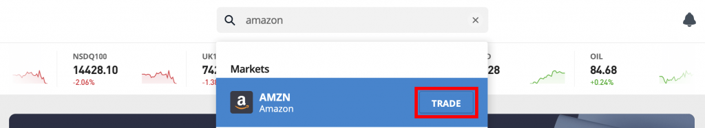 Írd be az eToro keresőjébe az Amazon kulcsszót, majd válaszd ki a kilistázott befektetést és kattints a TRADE gombra.