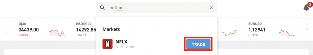 Az eToro keresőjében a Netflix kulcsszót beírva könnyen megtalálod a keresett részvényt. Írd be a Netflix kulcsszót, majd klikkelj a TRADE gombra.