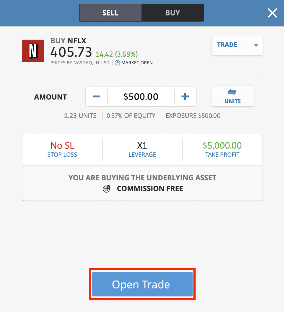 Miután beírtad az összeget és kiválasztottál minden szükséges opciót, az Open Trade gombra kattintva megvásárolhatod az első Netflix részvényedet.