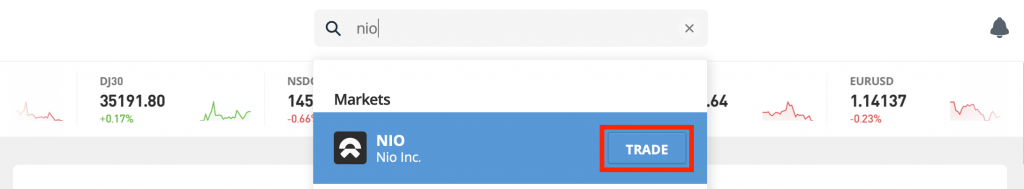 Írd be a NIO kulcsszót az eToro keresőjébe, majd klikkelj a TRADE gombra.