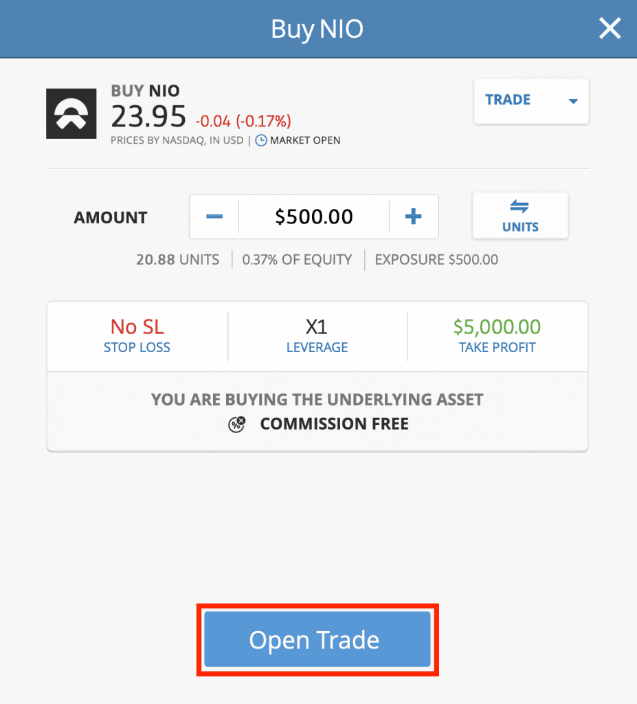 Az eToro keresőjébe a NIO kulcsszót beírva megtalálod a keresett részvényt. A TRADE gombra kattintva egy felugró ablak jelenik meg, amiben megadhatod a befektetni kívánt összeget.