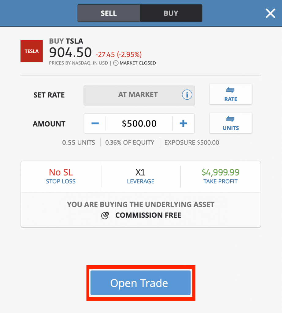 Miután beírtad az összeget és kiválasztottál minden szükséges opciót, az Open Trade gombra kattintva megvásárolhatod a Tesla részvényedet.