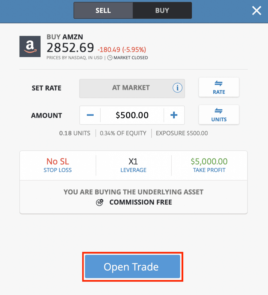 Miután beírtad az összeget és kiválasztottál minden szükséges opciót, az Open Trade gombra kattintva megvásárolhatod az Amazon részvényedet.