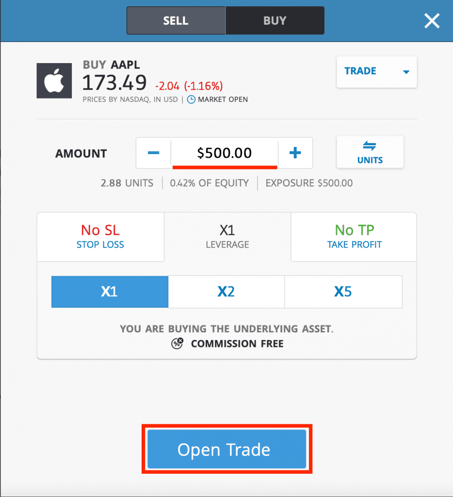 Miután beírtad az összeget és kiválasztottál minden szükséges opciót, az Open Trade gombra kattintva megvásárolhatod az első Apple részvényedet.