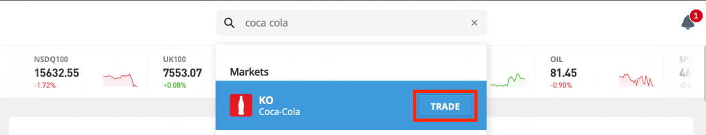 Írd be az eToro keresőjébe a Coca-Cola kulcsszót, majd válaszd ki a kívánt Coca-Cola részvényt és klikkelj a TRADE gombra.
