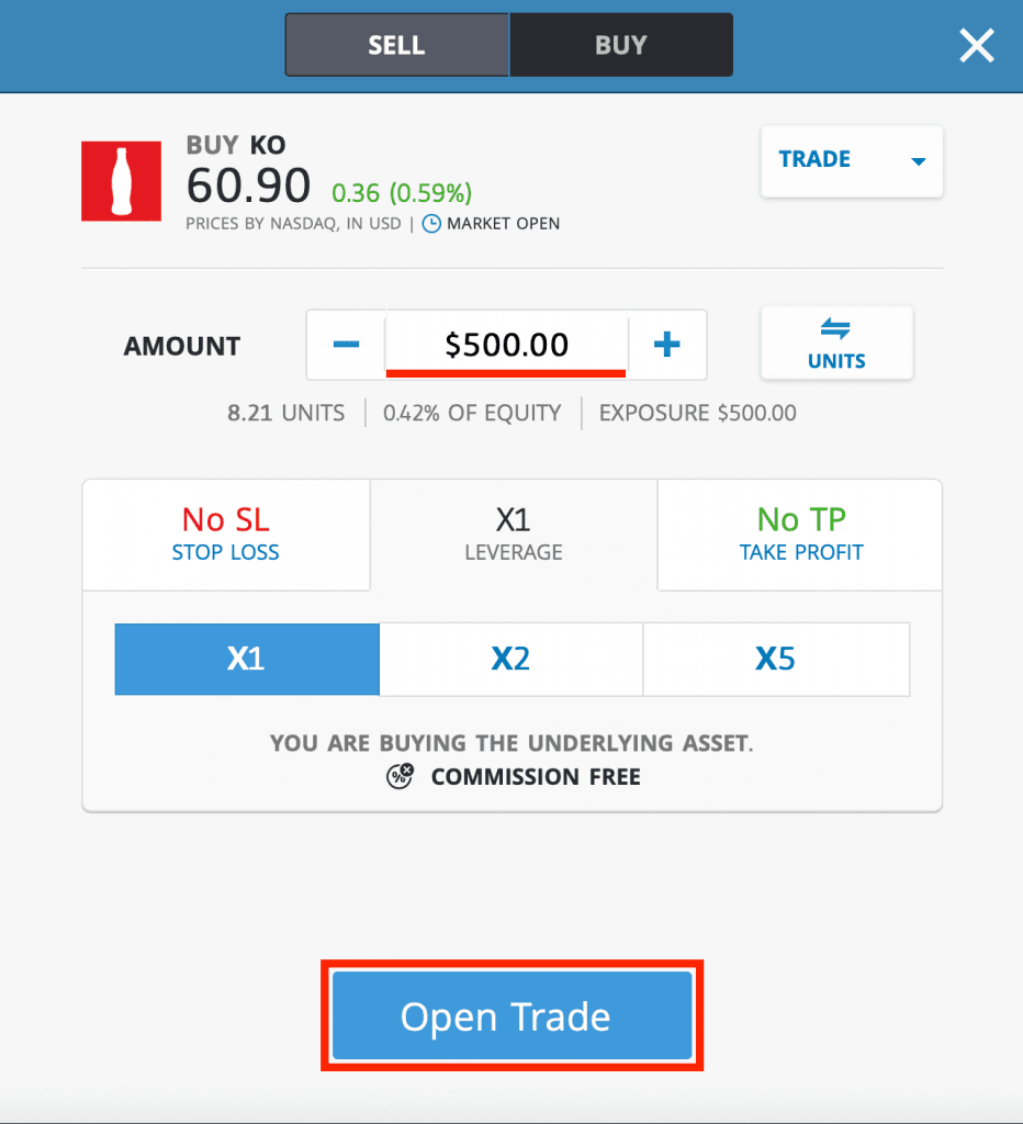 Miután beírtad az összeget és kiválasztottál minden szükséges opciót, az Open Trade gombra kattintva megvásárolhatod a Coca-Cola részvényedet.