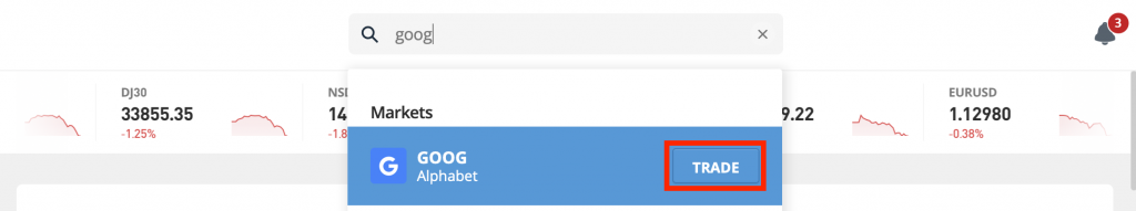 Az eToro-n található keresőben a Google vagy Alphabet kulcsszó beírásával könnyen megtalálod a két részvényt.