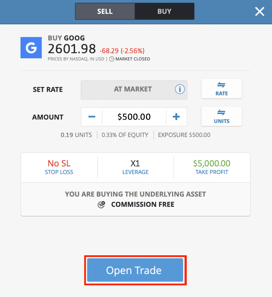 Miután beírtad az összeget és kiválasztottál minden szükséges opciót, az Open Trade** gombra kattintva megvásárolhatod a Google részvényedet.