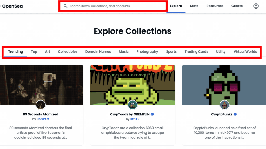 Az OpenSea keresőjét használva könnyen megtalálhatod azt az NFT-t, amelyet meg akarsz vásárolni. A Trending és Top fülek alatt megnézheted a jelenleg legfelkapottabb és legnépszerűbb NFT-ket.