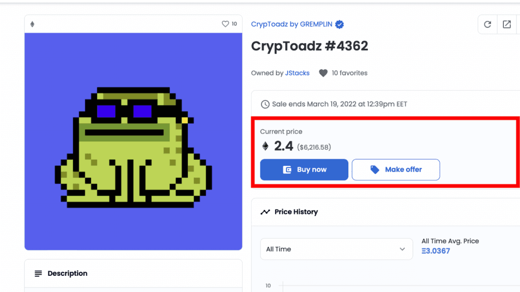 Ha az oldalon találsz egy eladó NFT-t, akkor a Make offer gombbal ajánlatot tudsz rá tenni. Ha az eladó által megadott villámáron szeretnéd ezt megvásárolni, akkor a Buy now gombbal azonnal megveheted az NFT-t.