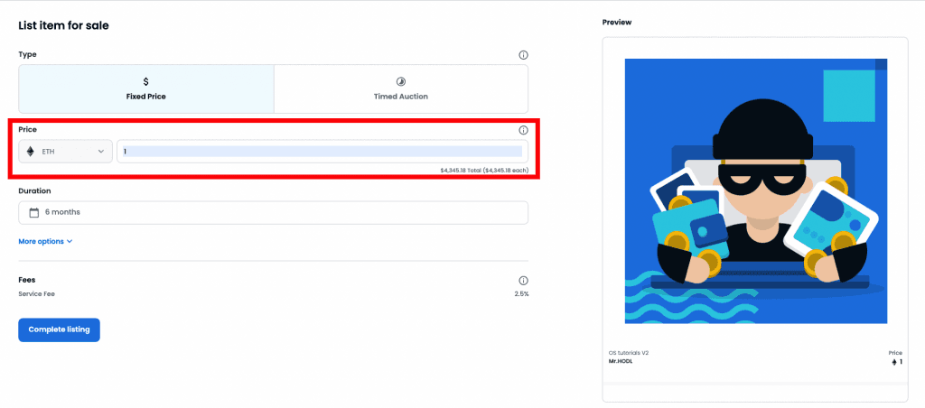 A következő ablakban be tudod állítani, hogy mennyiért szeretnéd eladni az NFT-t. Kiválaszthatod azt is, hogy fix áron add el a terméket.
