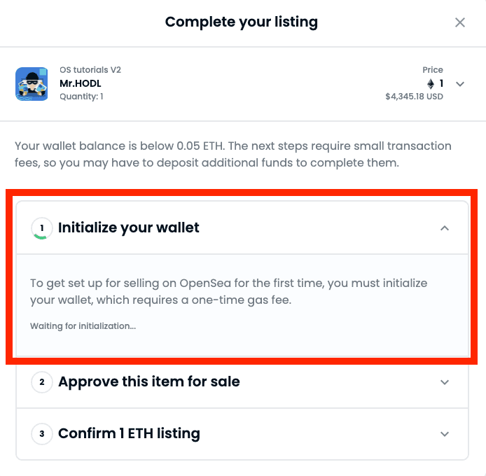 Megjegyzés: ha először adsz el OpenSea-n, akkor inicializálnod kell a pénztárcád, ami egy egyszeri díjjal jár.