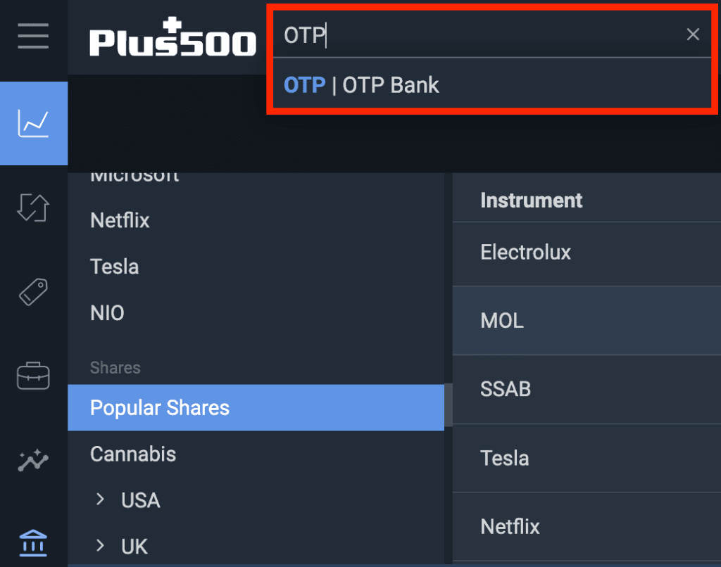 A Plus500 keresőjébe írd be az "OTP" kulcsszót, hogy könnyen megtaláld a befektetést. A listában klikkelj rá a talált részvényre.