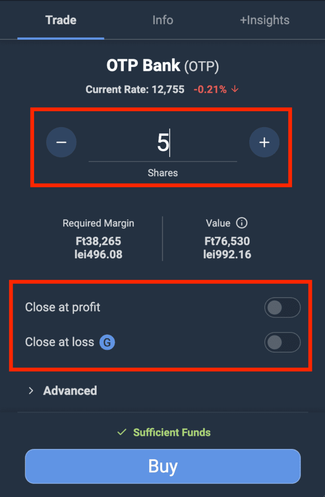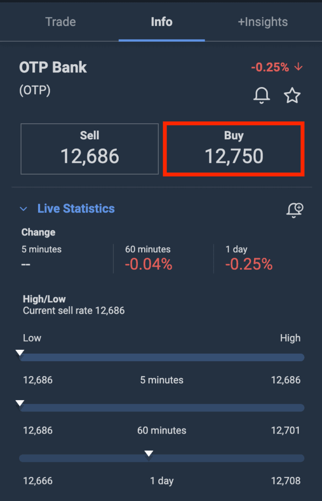 A Plus500 keresőjébe az OTP kulcsszót beírva meg fogod találni a keresett részvényt. Add meg a mennyiséget, és nyomj rá a vásárlás/eladás gombra!