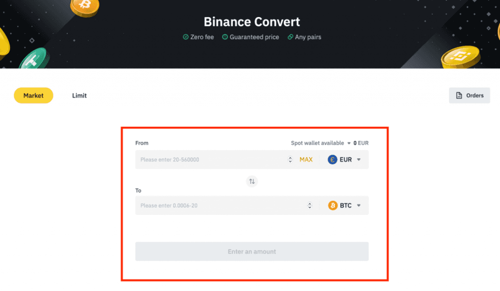 A konvertálás a legegyszerűbb módja a kriptovaluta vásárlásnak. Kiválasztod a platformon a Convert opciót, majd a devizát és azt a kriptovalutát, amit meg szeretnél vásárolni.