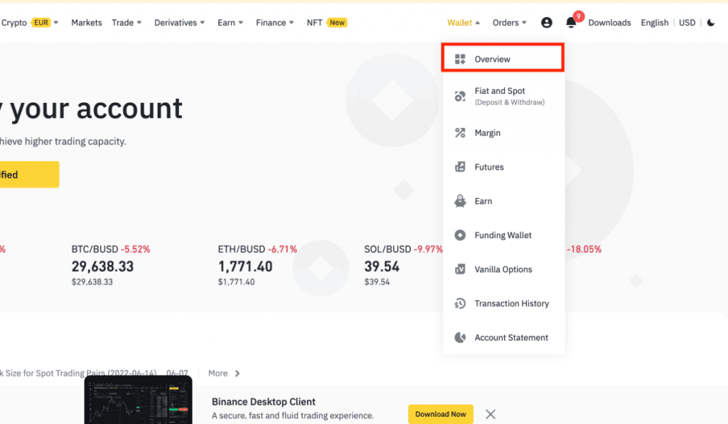 A fenti menüből válaszd ki a Wallet menüpontot, majd klikkelj az Overview gombra. Nézd meg a Deposit Crypto opciót.