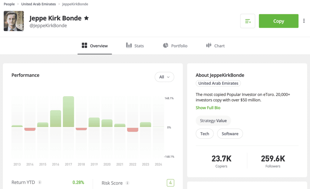A CopyTrader platform részletes kimutatásokat készít minden másolható befektetőről, így megtekintheted a múltbeli teljesítményüket, a kockázati szintjüket, és persze azokat a termékeket, amelyekbe befektetnek.