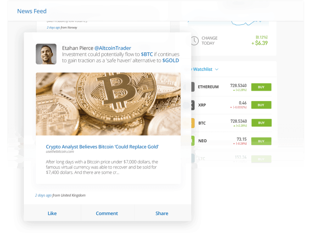 Az eToro egy Facebook-hoz hasonló platformmal rendelkezik, ahol a befektetők megoszthatják egymással a gondolataikat, tanácsaikat, elemzéseiket, és több módon is interakcióba léphetnek egymással, ami sok szempontból egy hasznos funkció.
