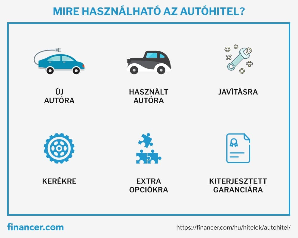 - Az autóhitelt felhasználhatod új vagy használt jármű vásárlására, extra opciókra, vagy bármilyen más autóval kapcsolatos kiadásra.