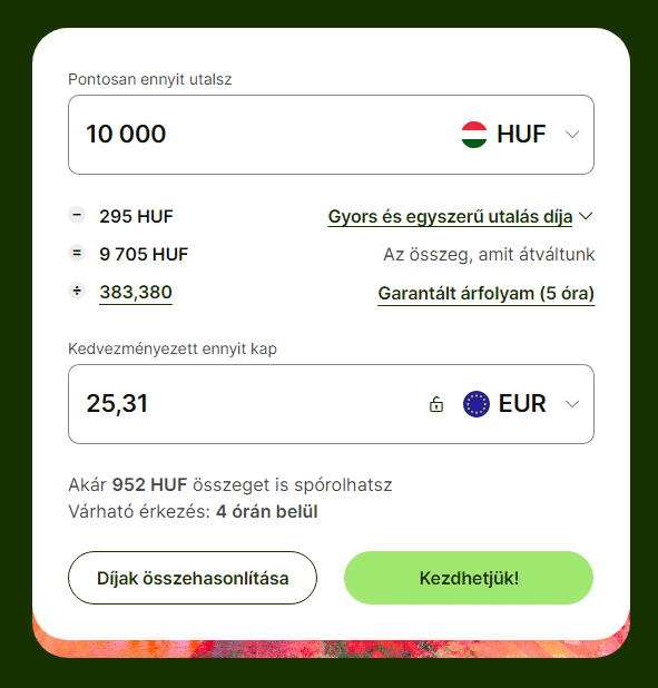 A platform pontosan megmutatja még az utalás megkezdése előtt, hogy a pénz milyen árfolyamon kerül átváltásra, mekkora díjat fogsz fizetni, és az is kiderül, hogy várhatóan mennyi időn belül érkezik meg az összeg.
